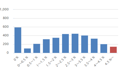 下の分布が日本市場における配当利回りとなりますが、4%以上の銘柄も400銘柄程度あります。