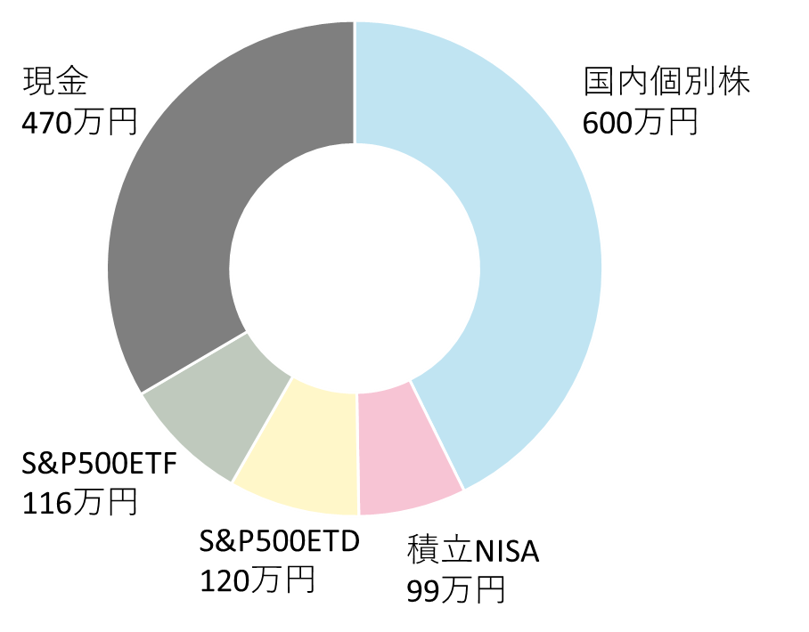 SBI証券と楽天証券で運用している国内個別株が600万円。松井証券で運用している積立NISAが99万円。SBI証券でS&P500連動ETFが120万円。S&P500連動ETF(ジュニアNISA)が116万円。現金が470万円です。