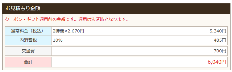 2時間で5,340円に、交通費700円が加わって、合計で6,040円となります。