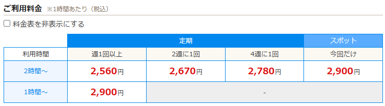 こま次郎の場合は、”2週に1回”、”2時間”利用しているので、1時間あたり2,670円となり、2時間で2,670円×2時間=5,340円です。