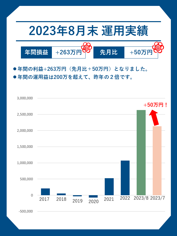 今回は、2023年8月末時点での資産運用実績を報告します。