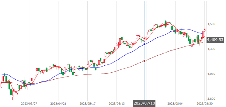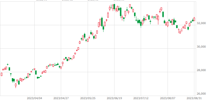 2023年8月の日経平均については、8月1日の高値33,488円を付けた以降、下落トレンドとなり、8月18日の安値31275円まで下がってから、再び上昇し、8月31日の終値は32,619円でした。